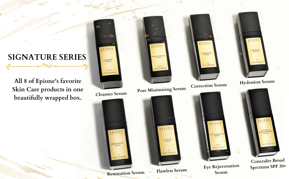 - BEAUTY & PERSONAL CARE– Experience the complete Epione face serum line in a beautiful gift box set. Includes Epione Cleanser Serum, Pore Minimizing Serum, Correction Serum, Hydration Serum, Eye Rejuvenation Serum, SPF 30+ Broad Spectrum Sunscreen, Restoration Serum, and Flawless Serum